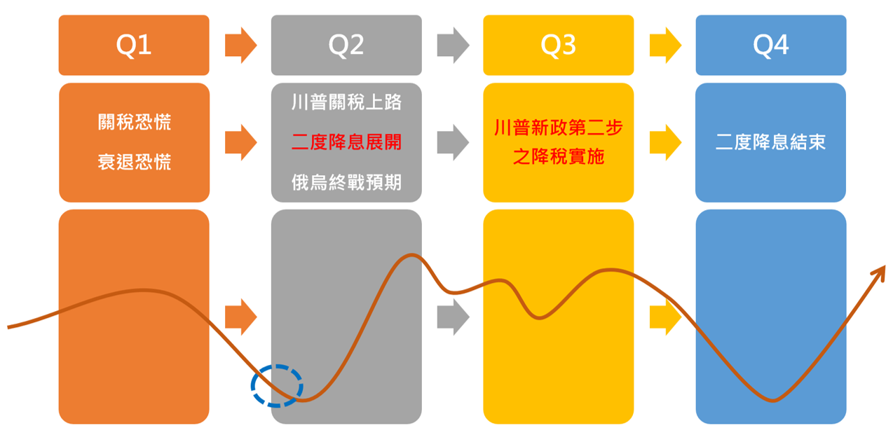 - 在關稅預期的提前消費動能下,Q2可能變成各種商品的提前旺季(為了趕在對等關稅談判期限90天內,美國終端消費者的90天提前囤貨潮、各國對於美國商品的承諾採購潮),從而影響今年Q2及Q3的股市走向,且Q2還有二度降息預期、俄烏終戰預期,美國企業降稅預期等,也都會同時刺激股市動能。反而是90天後的Q3可能變成利多出盡與提前消費結束後的相對淡季,屆時還要看二度降息與企業降稅的實質效應,才能決定股市是否還有續航力。